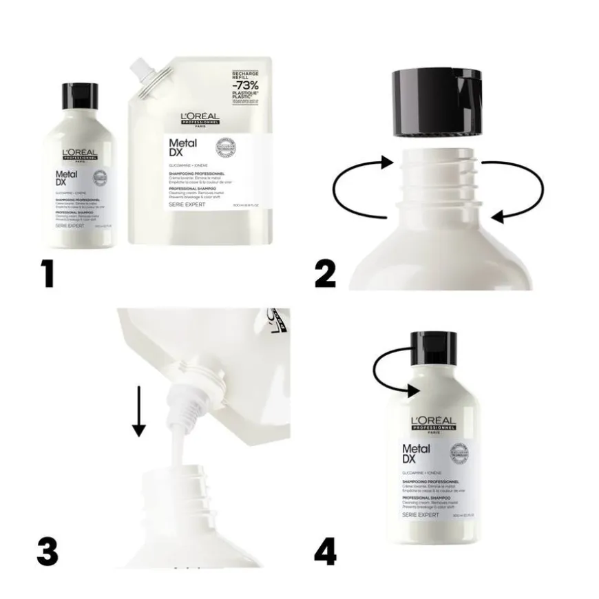 Metal DX Shampoo Refill er en shampoo i refill format spesielt utviklet for å beskytte håret mot metallpartikler som kobber, som kan trenge inn i hårfibrene og føre til knekte hårstrå og endringer i hårfargen. Beriket med glicoamin og ionen, renser denne sjampoen effektivt hårfiberet ved å fjerne opphopning av metallpartikler, samtidig som den gir håret glans og forbedrer fargeresultatet. Nå tilgjengelig i et refill-format med 73 % mindre plast, som gir en mer bærekraftig emballasje.