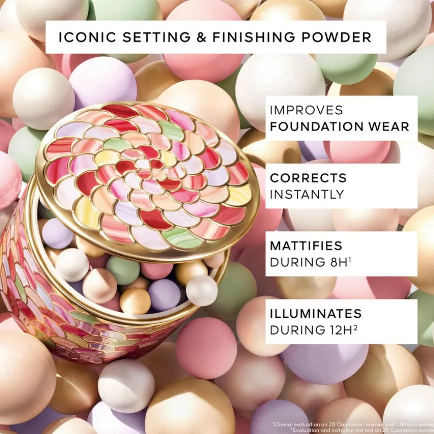 Météorites Pearls Of Powder er pudderperler og er et unikt produkt og et skjønnhetsikon som ble lansert i 1987, og som kombinerer alle fordelene med pudder i ett. De setter, korrigerer, matterer og fremfor alt fremhever, takket være kombinasjonen av fargede, matte perlemorsperler. Den ultralette konsistensen med 95 % naturlige ingredienser¹ garanterer en strålende hudfarge i 12 timer².