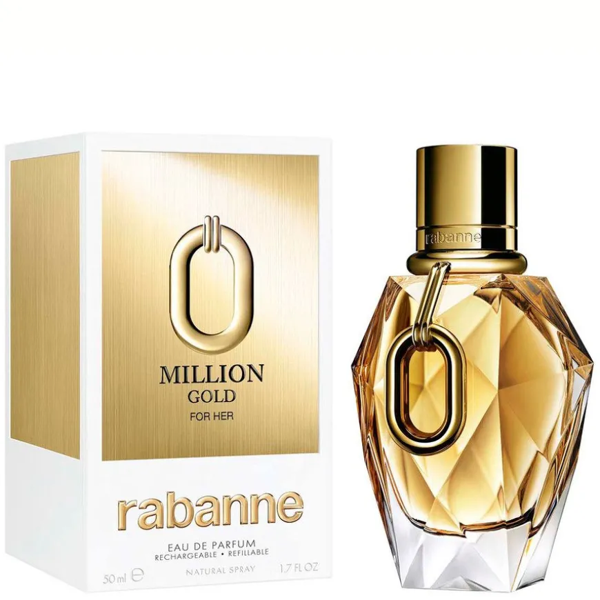 Million Gold for Her Eau de Parfum er en duft som utstråler en intens, glitrende energi, inspirert av suksess og luksus. Denne berusende og sensuelle duften er en del av Rabannes Grand Floral-kolleksjon og kombinerer feminine hvite blomster med gnistrende rose og en avhengighetsskapende mineral musk. Den innovative sammensetningen av metallisk roseoksid og saltaktig musk gir duften en unik kontrast. Flasken er like elegant som duften, designet med flerfasettert glass og prydet med Rabannes ikoniske XL lenke, som symboliserer selvtillit og suksess.