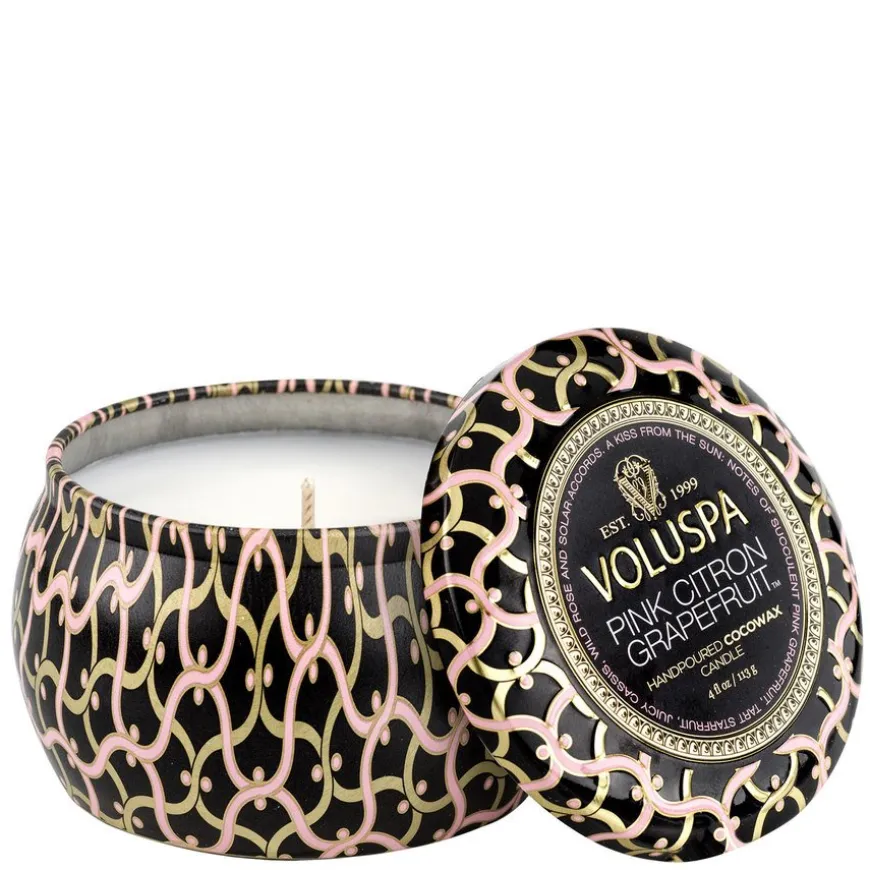 Pink Citron Grapefruit dufter av grapefrukt med et hint av nyplukkede roser og bær. Rike fargetoner pryder denne vakre tinnboksen.