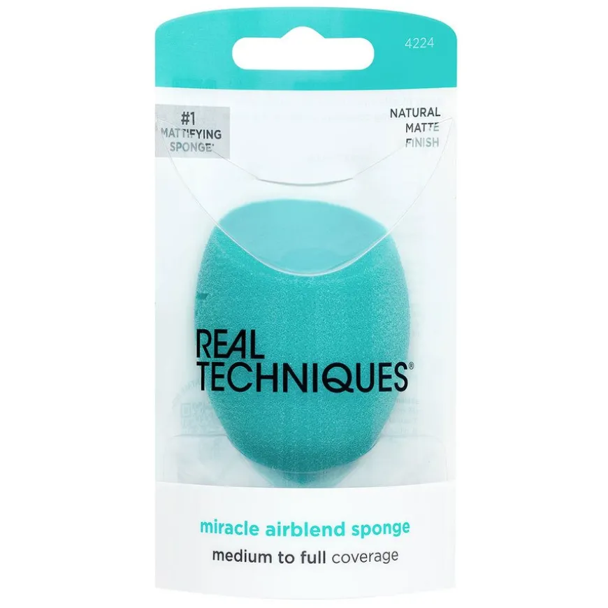 Miracle Airblend Sponge er en sminkesvamp med memory foam-teknologi som klemmer hudoverflaten for en sømløs påføring, som resulterer i sminke med middels til full dekning med en naturlig matt finish. Fra skaperne av sminkesvamp nr. 1 – Real Techniques elskede form har holdt seg den samme, men nå med ny memory foam-teknologi som gir mer dekning og som resulterer i en matt finish. Bruk den flate kanten til å først påføre, presisjonstuppen for å skjule, og blend det hele ut med den runde siden.