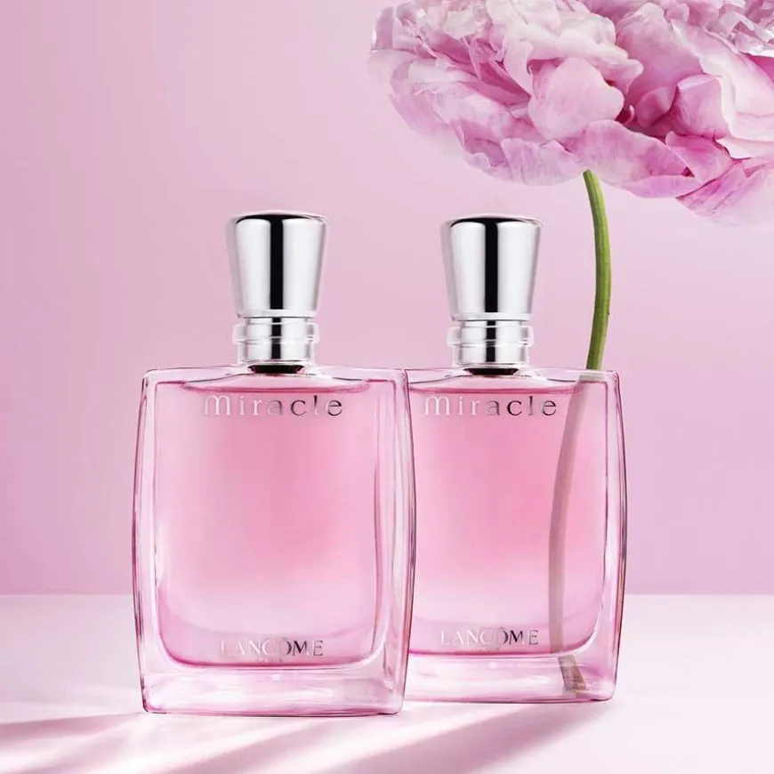 Miracle-flasken er ren, moderne og elegant. Den er et skinnende blankt lysprisme, hvor det transparente glasset avslører duftens rosa farge, som et symbol på daggryets vakre rosenrøde farge.