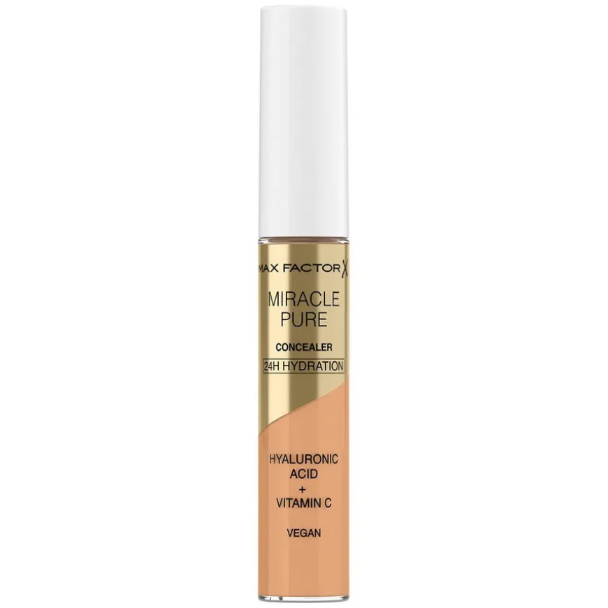 Max Factor Miracle Pure Concealer er klinisk bevist å ta vare på huden mens du bruker den. Den lette formelen inneholder hyaluronsyre, vitamin C og peptider. Den gir middels, naturlig dekning og fungerer perfekt på ansiktet og under øynene, gir rynkefri, skånsom dekning hele dagen. Lysnende og gir 24-timers fuktighet. Klinisk og dermatologisk testet, egnet for sensitiv hud; med en supermyk, fleksibel og presis applikator. Tilgjengelig i flere nyanser og designet for å fungere i harmoni med Max Factors Miracle Pure foundation.