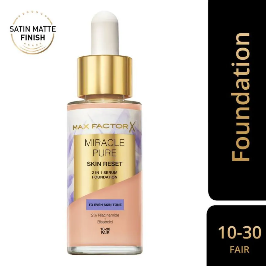 Max Factor Miracle Pure Skin Reset 2 In 1 Serum Foundation er en 2-i-1 serumformel kombinert med flytende foundation som gir øyeblikkelig perfekt dekning og en jevnere hudtone. Opplev en sunn hud med medium, naturlig dekning og satin-matt finish. Passer for sensitiv hud.