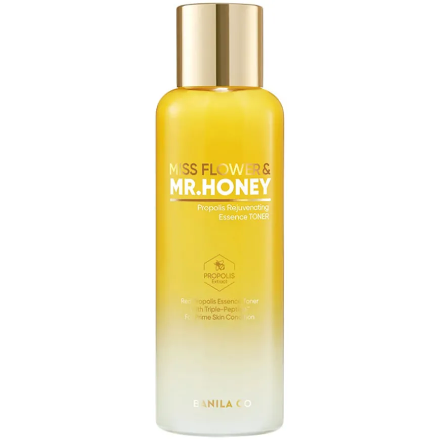 Miss Flower & Mr.Honey propolis Rejuvenating Essence Toner er full av premium honing-ingredienser som smelter inn i huden. Produktet er en 2-i-1 essence-toner og bidrar til en velpleiet, hydrert og myk hud ved hjelp av næringsrike ingredienser. Formuleringen trekker inn i dybden og etterlater huden jevn med en sunn og frisk glød.
