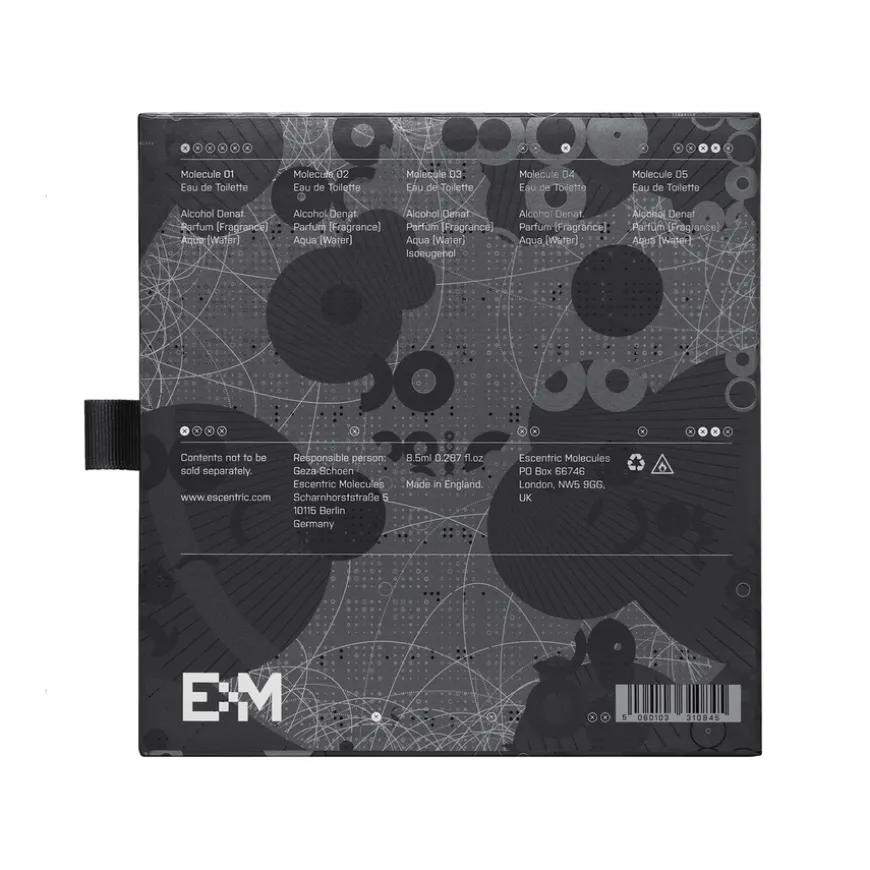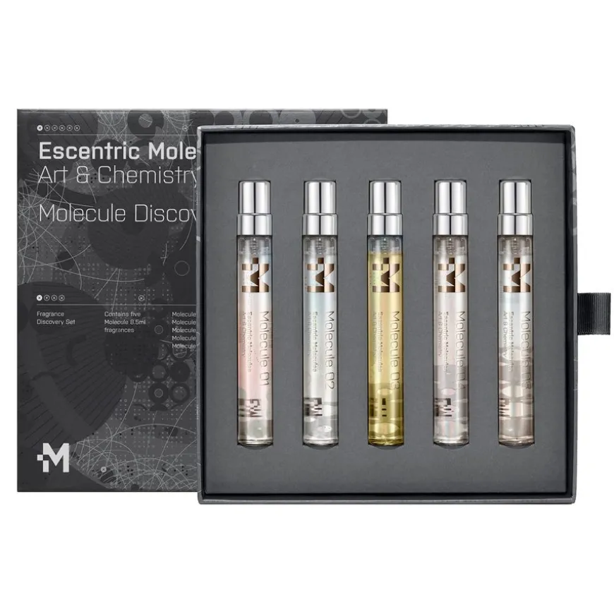 Molecule Discovery Set er laget for å oppmuntre og tilfredsstille din luktende nysgjerrighet. Dette settet er designet for utforskning og lar deg gjenoppdage alle fem av Molecule-duftene før du bestemmer deg for din favorittlukt. Duftene er plassert i 8,5ml miniampuller, nedskalert for å utforske den radielle verdenen til Molecule og dekke alle duftbehovene dine mens du er på farten. De rene og unike, Molecule-duftene er radikalt minimalistiske og hyller de kjemiske duftene som utgjør hoveddelen av parfymene selv. Geza Schoen ønsket å ta en konseptuell tilnærming til luktkreativitet og innovere på et molekylært nivå ved å redusere en duft ned til dens essensielle elementer. Effekter, ikke dufter, der en enkelt aroma-kjemisk tone gir de mest dynamiske resultatene: friskhet og sexappeal. Molekyl 01: Revolusjonær minimalisme; Molekyl 02: Mineral rav; Molekyl 03: Grasrot; Molecule 04: Cocooning Radiance; Molecule 05: Piney Cashmere. Alle fem Molecule-duftene er fulle av karakter og uutgrunnelige for kjønnsforskjeller. Disse humørfylte skjønnhetene inneholder alle et nett av flere betydninger, definisjoner og sensasjoner. For å oppdage EMs Escentric-dufter, kjøp deres Escentric Discovery Kit, som inneholder EMs fem 8,5 ml elskede flasker med syntetisk parfyme.