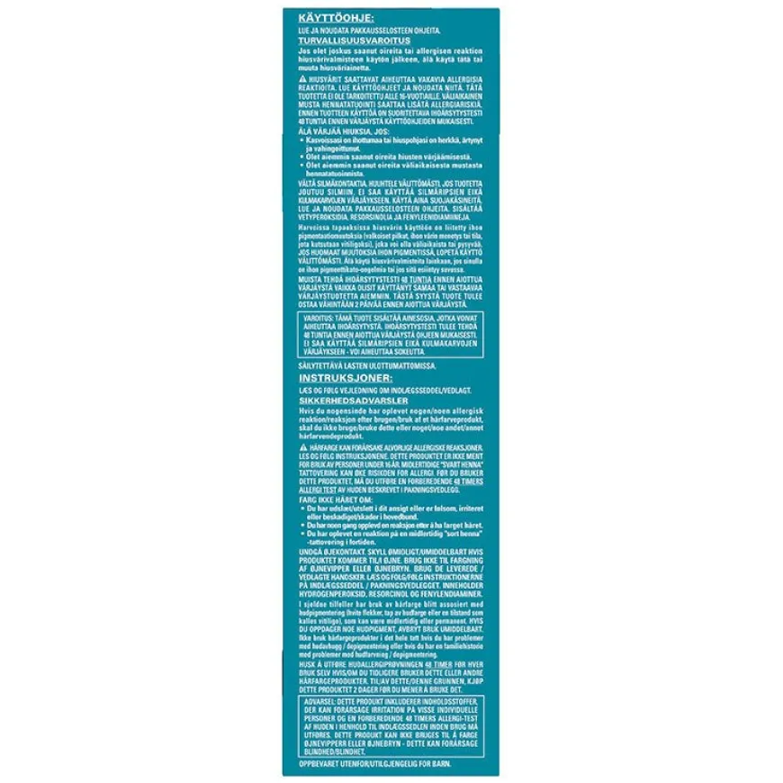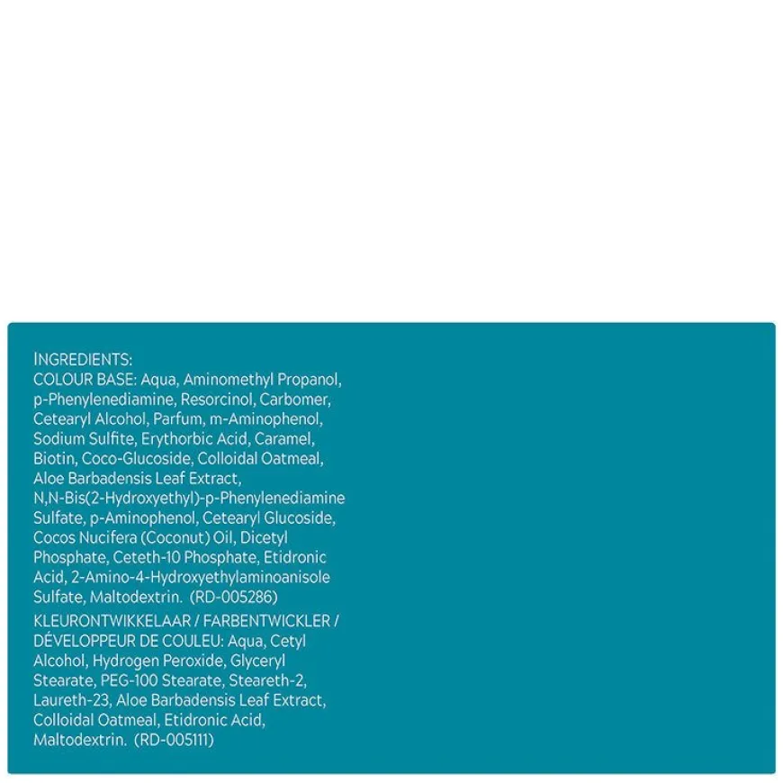 Färg: Aqua,+C20C3:C27,Coco-Glucoside,Aminomethyl Propanol,Carbomer,p-Phenylenediamine,Resorcinol,Parfum,m-Aminophenol,Sodium Sulfite,Erythorbic Acid,N,N-Bis(2-Hydroxyethyl)-p-Phenylenediamine Sulfate,p-Aminophenol,Caramel,Trisodium EDTA,Cinnamidopropyltrimonium Chloride,Laurdimonium Hydroxypropyl Hydrolyzed Wheat Protein,2-Amino-4-Hydroxyethylaminoanisole Sulfate,Aloe Barbadensis Leaf Juice,Chamomilla Recutita (Matricaria) Flower Extract,Panthenol,Tocopheryl Acetate,Linalool,Limonene,Alpha-Isomethyl Ionone,Benzyl Benzoate FÄRGUTVECKLAREN: Aqua,Cetyl Alcohol,Hydrogen Peroxide,Glyceryl Stearate,PEG-100 Stearate,Steareth-2,Laureth-23,Aloe Barbadensis Leaf Extract,Colloidal Oatmeal,Etidronic Acid,Maltodextrin