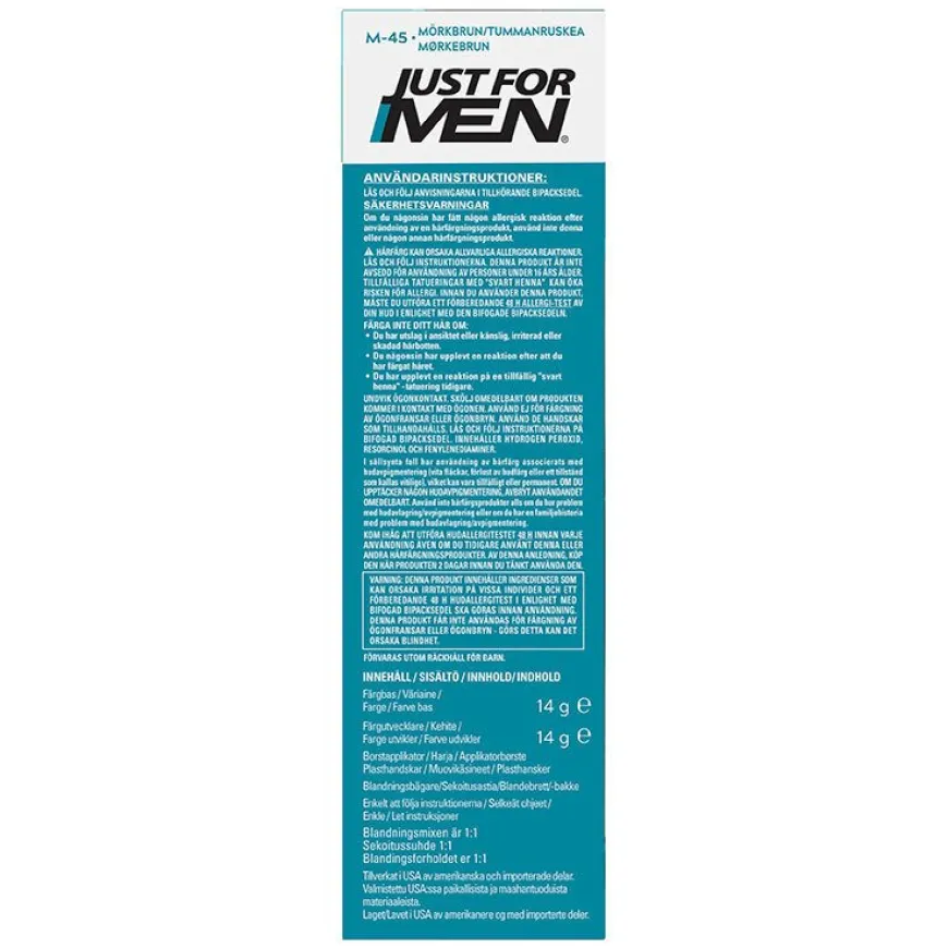 Moustache & Beard Dark Browner en skjegg og kinnskjeggfarge laget for menn og deres skjegg. Pakken inneholder en gel som er lett å påføre ved å bruke den medfølgende børsten. Produktet er designet for å farge selv det groveste ansiktshåret. Hver nyanse av skjeggfargen matcher den samme hårfargen Just For Men. Produktet inneholder vitamin E, protein, kamille og aloe for tykkere, sunnere hår som er lett å kontrollere.Produktet inneholder ingen skadelig ammoniakk. Skjegget ditt vil se tykkere, fyldigere og mer velstelt ut.