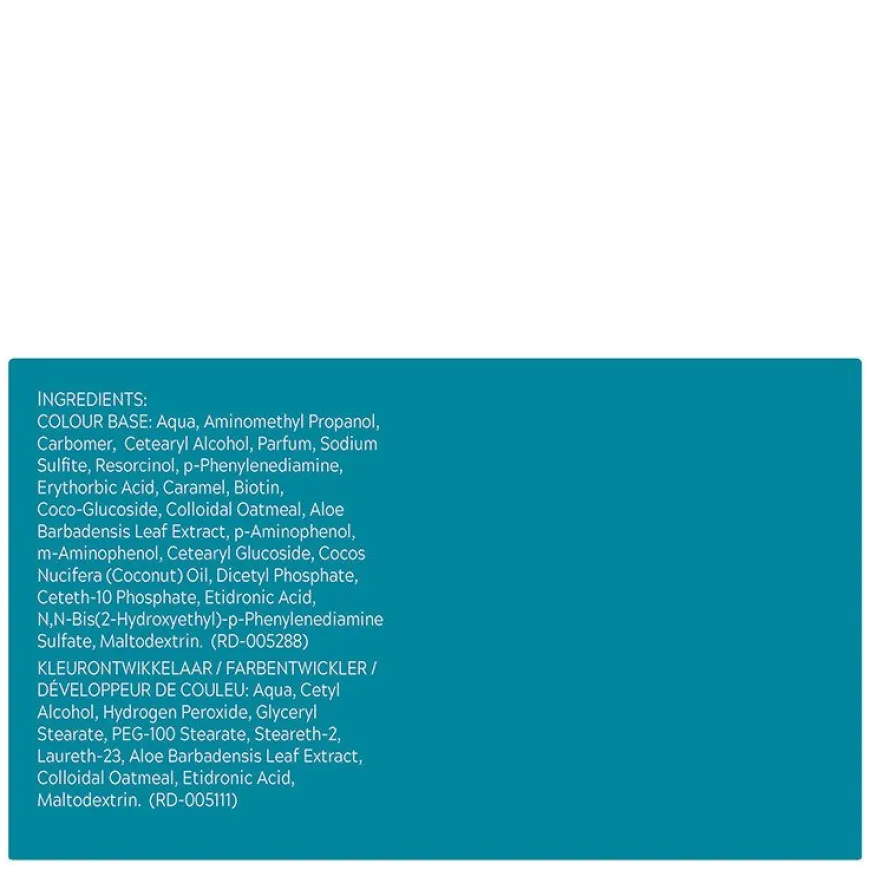 Färg: Aqua,Coco-Glucoside,Aminomethyl Propanol,Carbomer,Parfum,Sodium Sulfite,Resorcinol,Erythorbic Acid,p-Phenylenediamine,Trisodium EDTA,Caramel,p-Aminophenolm-Aminophenol,N,N-Bis(2-Hydroxyethyl)-p-Phenylenediamine Sulfate,Cinnamidopropyltrimonium Chloride,Laurdimonium Hydroxypropyl Hydrolyzed Wheat Protein,Aloe Barbadensis Leaf Juice Chamomilla Recutita (Matricaria) Flower Extract,Panthenol,Tocopheryl AcetateLinalool,Limonene,Alpha-Isomethyl Ionone,Benzyl Benzoate FÄRGUTVECKLAREN: Aqua,Cetyl Alcohol,Hydrogen Peroxide,Glyceryl Stearate,PEG-100 Stearate,Steareth-2,Laureth-23,Aloe Barbadensis Leaf Extract,Colloidal Oatmeal,Etidronic Acid,Maltodextrin