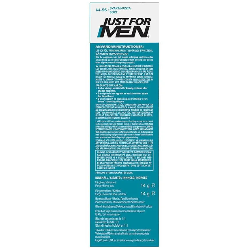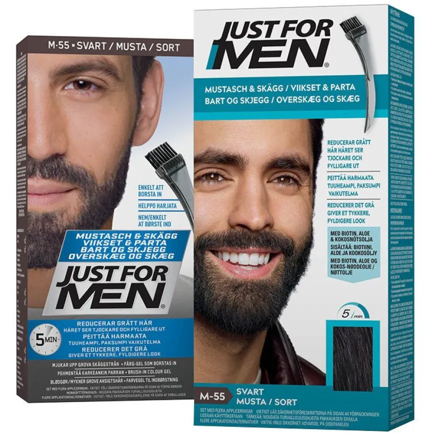 Moustache & Beard Real Blacker en skjegg og kinnskjeggfarge laget for menn og deres skjegg. Pakken inneholder en gel som er lett å påføre ved å bruke den medfølgende børsten. Produktet er designet for å farge selv det groveste ansiktshåret. Hver nyanse av skjeggfargen matcher den samme hårfargen Just For Men. Produktet inneholder vitamin E, protein, kamille og aloe for tykkere, sunnere hår som er lett å kontrollere.Produktet inneholder ingen skadelig ammoniakk. Skjegget ditt vil se tykkere, fyldigere og mer velstelt ut.