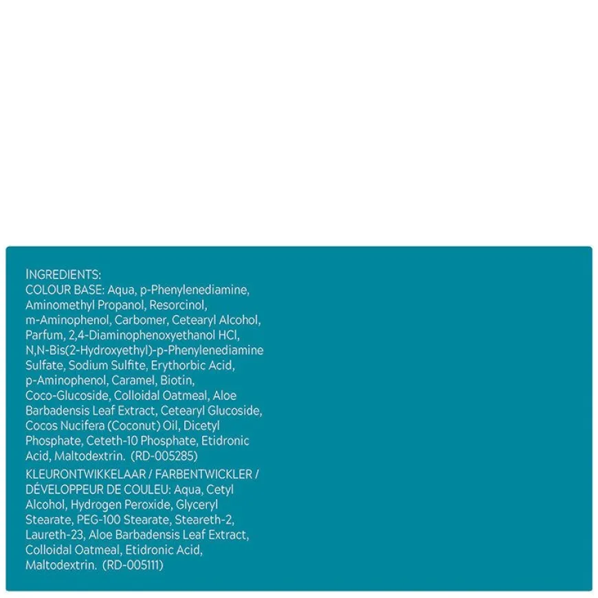 Färg: Aqua,Coco-Glucoside, Aminomethyl Propanol,p-Phenylenediamine,Resorcinol,4-Chlororesorcinol,Carbomer,m-Aminophenol,Parfum,2,4-Diaminophenoxyethanol Sulfate,N,N-Bis(2-Hydroxyethyl)-p-Phenylenediamine Sulfate,Sodium Sulfite,Erythorbic Acid,p-Aminophenol,Caramel,Trisodium EDTA,Cinnamidopropyltrimonium Chloride,Laurdimonium Hydroxypropyl Hydrolyzed Wheat Protein,Aloe Barbadensis Leaf Juice,Chamomilla Recutita Flower Extract,Panthenol,Tocopheryl Acetate,Linalool,Limonene,Alpha-Isomethyl Ionone,Benzyl Benzoate FÄRGUTVECKLAREN: Aqua,Cetyl Alcohol,Hydrogen Peroxide,Glyceryl Stearate,PEG-100 Stearate,Steareth-2,Laureth-23,Aloe Barbadensis Leaf Extract,Colloidal Oatmeal,Etidronic Acid,Maltodextrin