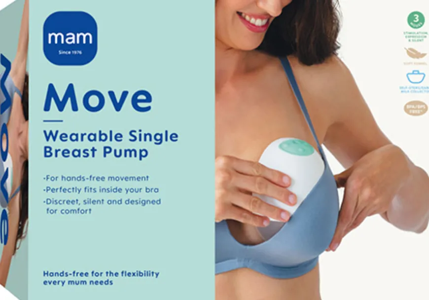 Move Wearable Brystpumpe er en handsfree brystpumpe som passer i BH-en, slik at du har hendene fri og kan pumpe når og hvor som helst. Den har 3 ulike innstillinger og 5 intensitetsnivåer per innstilling: Stimuleringsmodus, som gir en kort, rask pumpefrekvens som etterligner barnets naturlige sugeatferd og stimulerer melkeproduksjonen. Utpumpingsmodus, for effektiv utpumping av melk. Stillegående modus for ekstra diskret og rolig pumping. Det følger med komfortable traktinnsatser i varierende størrelser (15mm, 17mm og 21mm). Brystpumpen stopper automatisk når melkebeholderen er full. Det følger også med en Easy Start™ Anti-Colic-flaske (160ml). Flaskens innovative antikolikksystem gir en jevn drikkeflyt og sørger for at barnet ditt svelger mindre luft. Alle pumpedelene som kommer i kontakt med morsmelk, kan rengjøres i oppvaskmaskin og med alle vanlige steriliseringsmetoder. Uten slanger eller kabler gjør MAM Move din ammeopplevelse så fri, komfortabel og fleksibel som mulig.