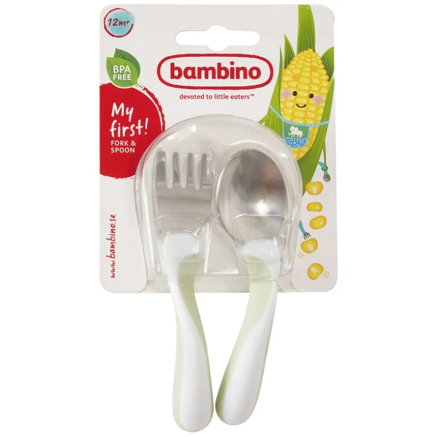 Bambino My First Spoon and Fork er et praktisk og flott bestikksett, som er tilpasset barnets første år. Settet består av en skje og gaffel i mykt materiale med ergonomiske håndtak, som er lett å holde fast i for små barnehender. Bestikket har avrunde kanter på gaffelen og et bredt blad på skjeen. Settet er laget i rustfritt stål.