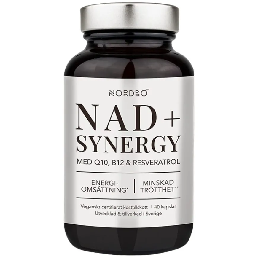 NAD+ Synergy er et kosttilskudd for energiomsetning, psykologisk funksjon og redusert tretthet. Inneholder nikotinamidribosidklorid (NR), koenzym Q10, vitamin B12 og resveratrol – en kombinasjon som bidrar til å støtte mitokondrienes funksjon og redusere oksidativt stress. Vitamin B12 støtter normal energiomsetning, nervesystemets funksjon og motvirker utmattelse. Koenzym Q10 arbeider i synergi med NAD+ for energiproduksjon. Resveratrol er en antioksidant fra planter. Passer spesielt godt for voksne over 35 år som ønsker å støtte kroppen i en sunn aldringsprosess. Produktet er vegansk og fritt for gluten, sukker, soya og laktose.