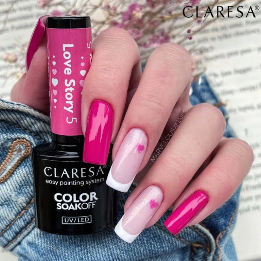 Hybrid neglelakk (soak-off) fra Claresa med varighet på opptil 4 uker. Produktet brukes sammen med Claresa basecoat og topcoat og må herdes i UV/LED-lampe.
