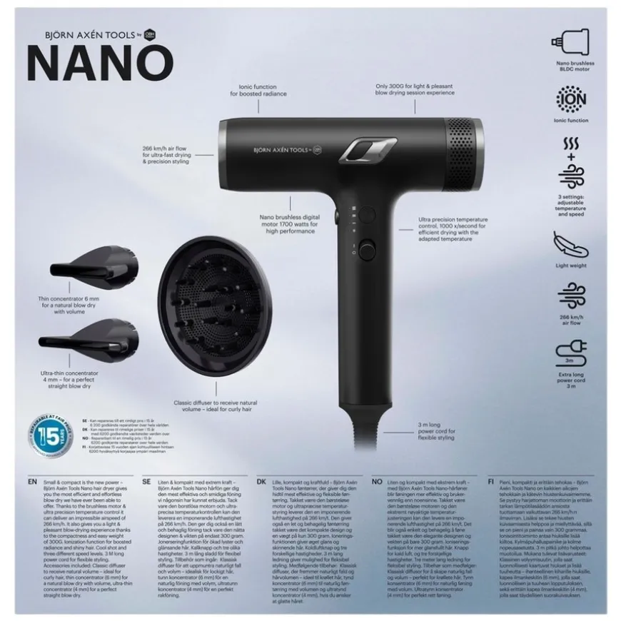 Nano Hair Dryer er en kompakt og kraftig hårføner som gir rask og stillegående styling uten å gå på kompromiss med ytelse. Den avanserte Nano-motoren og vekten på kun 300g gjør den ideell for både hjemmebruk og reise. Ionic-teknologien bidrar til å redusere frizz og tilføre naturlig glans til håret ved hjelp av negative ioner som glatter hårstråene. Med tre hastigheter og varmeinnstillinger kan hårføningen tilpasses alle hårtyper og behov, fra skånsom tørking til rask styling. Cool shot-funksjonen gir et profesjonelt resultat ved å fiksere frisyren og lukke hårstråenes skjellag for et glatt og glansfullt resultat. Passer for alle hårtyper og er perfekt for deg som ønsker høy ytelse i en lett og praktisk design.