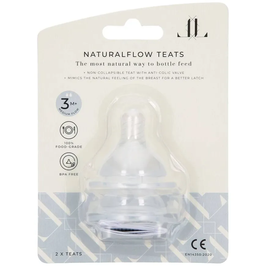 NaturalFlow Teats er designet for å gjøre overgangen mellom bryst og flaske så naturlig som mulig. De brystformede flaskesmokkene i supermyk, ikke-kollapsende silikon stimulerer et naturlig sugetak og etterligner følelsen av amming. Hver smokk har en antikolikkventil som leder luft bort fra babyens mage, reduserer ubehag og bidrar til roligere måltider. Smokkene passer til Lola&Lykke NaturalFlow Baby Bottles og kommer i pakker med to. De finnes i tre strømningshastigheter tilpasset babyens alder og behov: