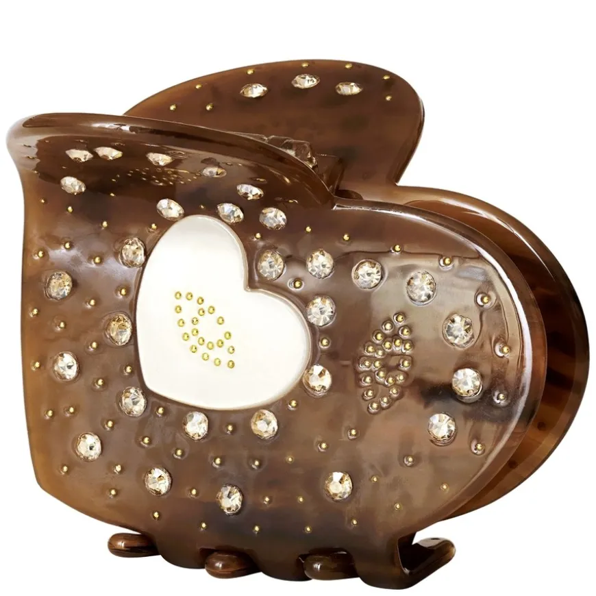 Nayeli Hairclaw Mocha fra Maanesten er et iøynefallende hårsmykke med en overraskende hjerteform som fanger blikket ved første øyekast. Detaljene med glitrende rhinestones og det evigvarende tredje øyet i midten tilfører en mystisk og sofistikert touch. Hårklypen er laget av acetat og jern med miljøvennlig elektrobelegg, som gir både holdbarhet og eleganse. Med en bredde på 7 cm og en høyde på 6 cm er den perfekt for å holde håret på plass med stil – enten til hverdags eller spesielle anledninger.