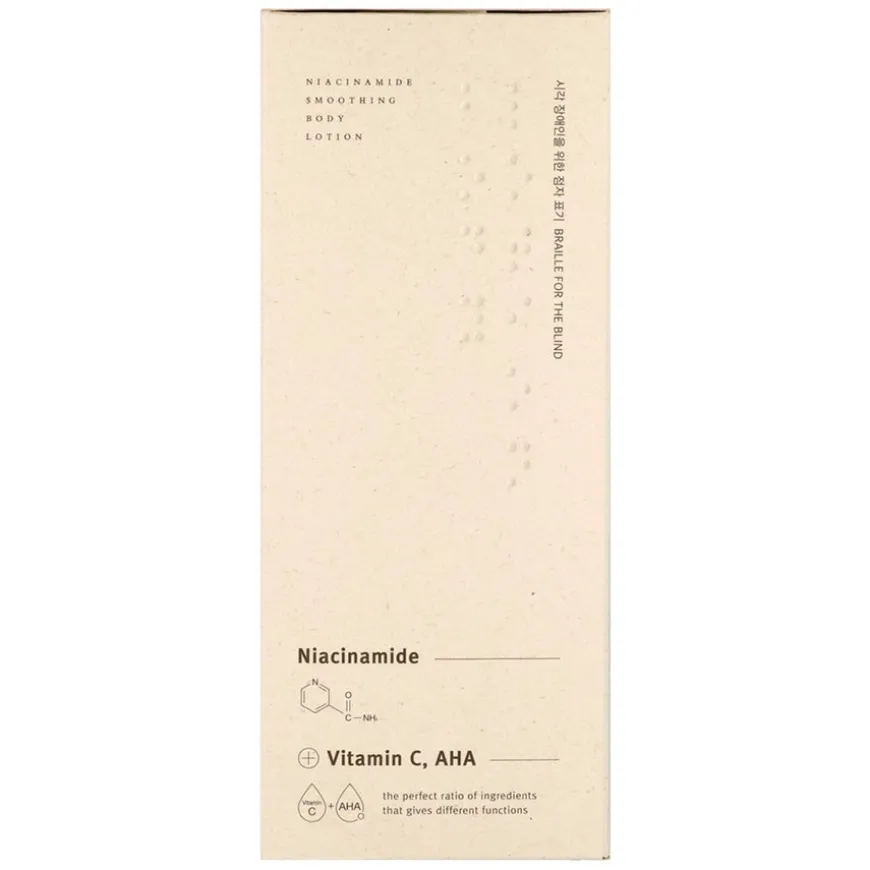 Niacinamide Smoothing Body Lotion er en bodylotion tilsatt 10% niacinamid, C-vitamin og AHA som fukter og lysner matt hudtone. Denne lotionen hjelper med å motvirke hyperpigmentering og gjør huden smidig og glatt. Den er duftfri og dermatologisk testet, noe som gjør den ideell for sensitiv hud. Lotionen gir intensiv fuktighet og bidrar til en jevnere og mer strålende hudtone.