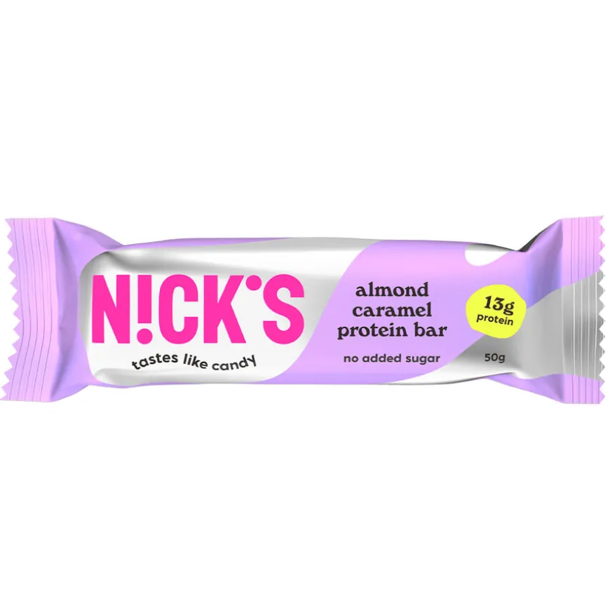 Nick’s Soft Protein Bar Almond Caramel er en myk proteinbar med et lag av flytende karamell, myk protein overtrukket med melkesjokolade. Selvføgelig uten tilsatt sukker, fri for både maltitol, palmeolje og gluten