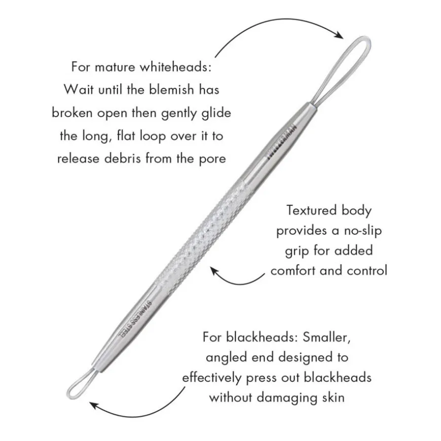 Et genialt og spesialutviklet verktøy for å fjerne hudormer. Enden med den tynne vinklede løkken fjerner hvite hudormer når man drar den over det aktuelle området. Enden med den avflatede løkken presser ut sorte prikker/sorte hudormer. Skaftet har tekstur som gir verktøyet et «no-slip-grip» for optimal kontroll. For best resultat; rens huden i forkant med varmt vann eller ta en varm dusj for å åpne opp porene. Rens både hud og verktøy etter utklemming. Kommer i rustfritt stål og kan steriliseres.