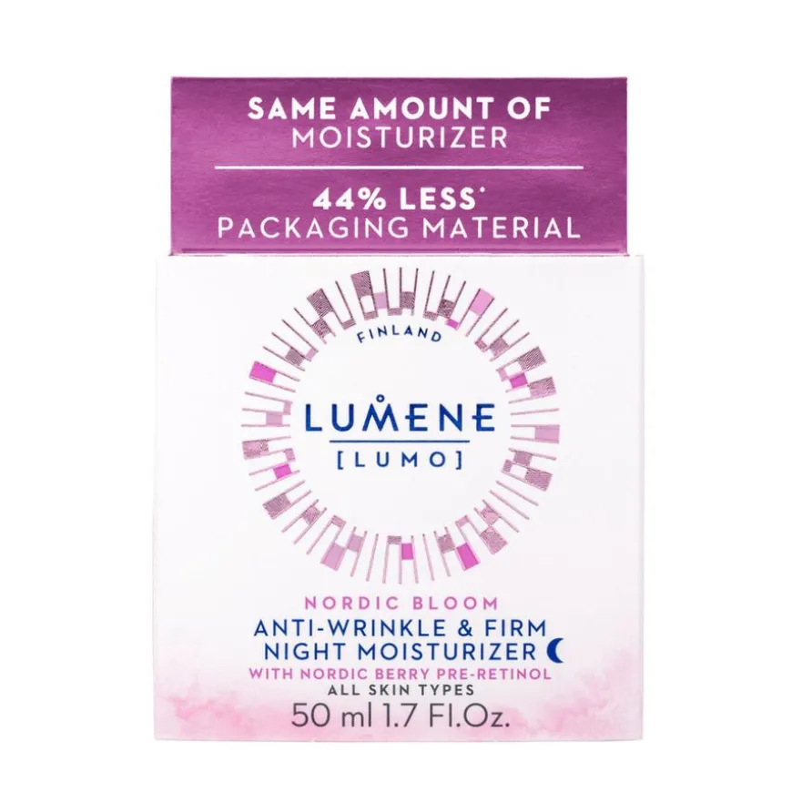 Lumo Nordic Bloom Anti-Wrinkle & Firm Night Moisturizer er en gjenoppbyggende nattkrem som fukter huden og får den til å se fastere ut og reduserer rynker. Huden ser uthvilt og forynget ut. Den pleiende sammensetningen er beriket med det innovative Nordic Berry Pre-Retinol-komplekset og Lumenes patenterte, quercetinrike nordiske tyttebærekstrakt. Produktet er vegansk.