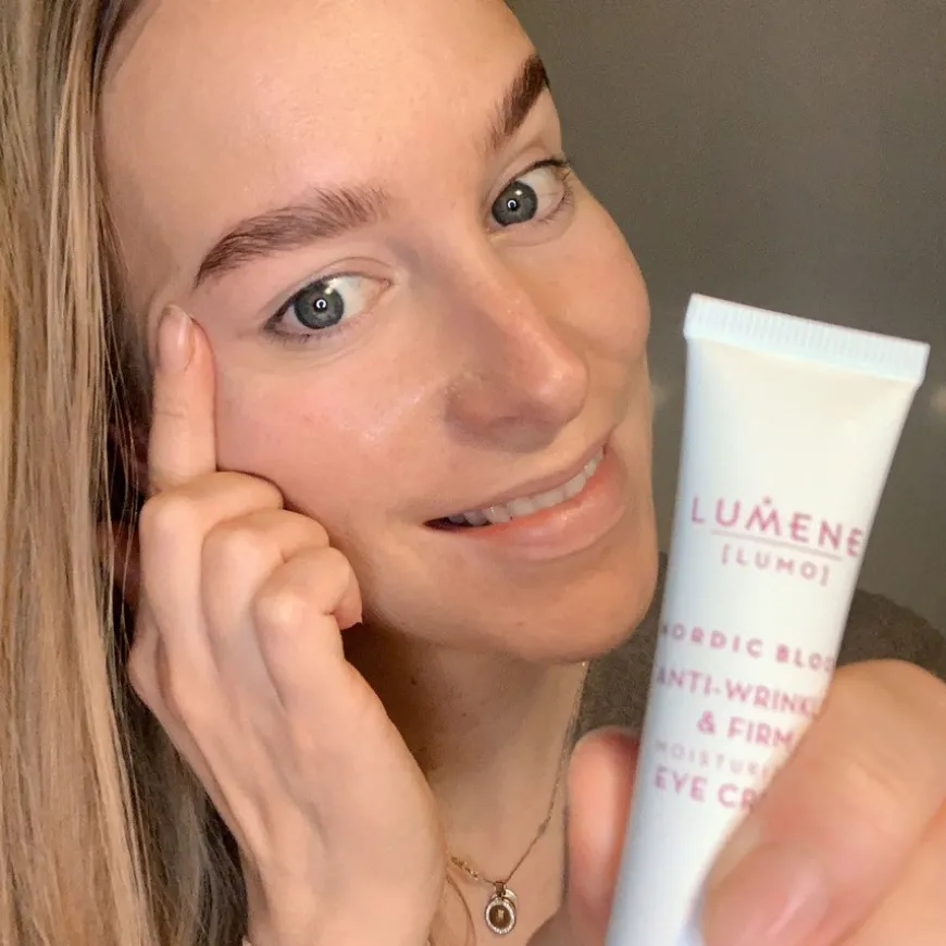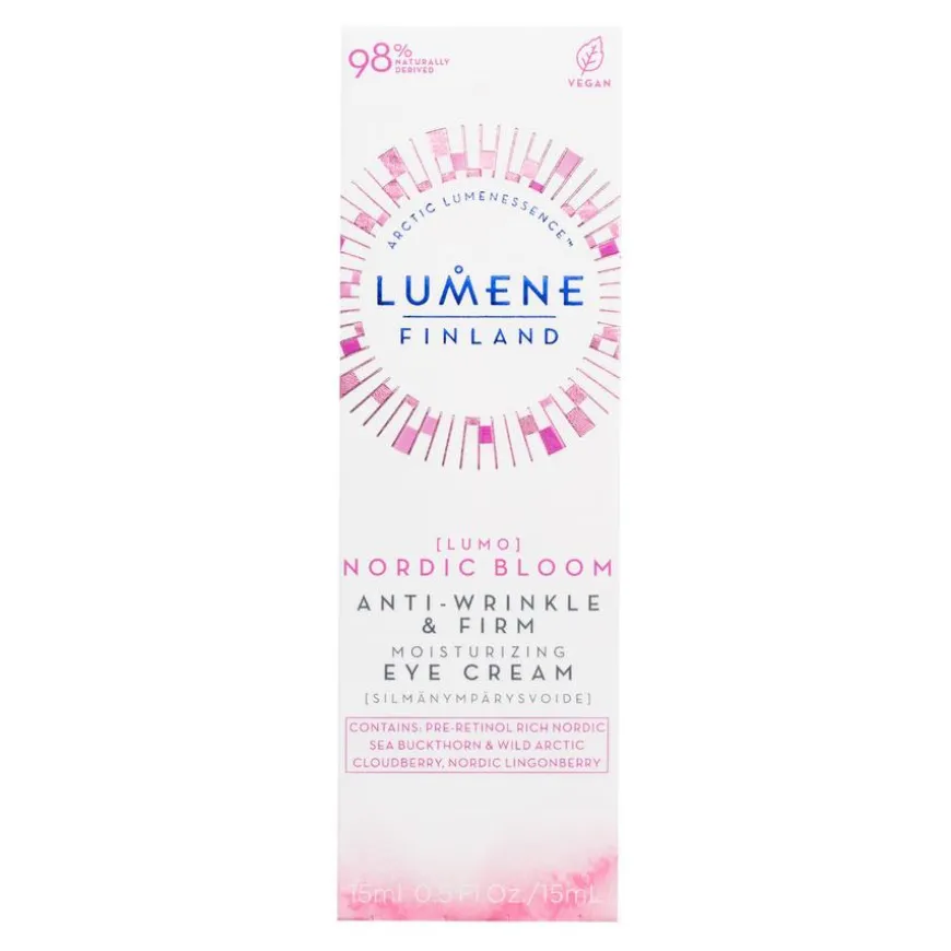 Lumo Nordic Bloom Anti-Wrinkle & Firm Moisturizing Eye Cream er en øyekrem som gir fuktighet til huden, får den til å se fastere ut og reduserer rynker. Det hjelper også med å redusere mørke ringer og hevelse under øynene. Sammensetningen er beriket med det innovative Nordic Berry Pre-Retinol-komplekset og Lumenes patenterte quercetinrike nordiske tyttebærekstrakt. Den lette formelen passer perfekt under sminke.