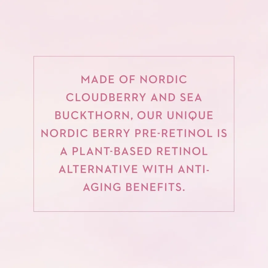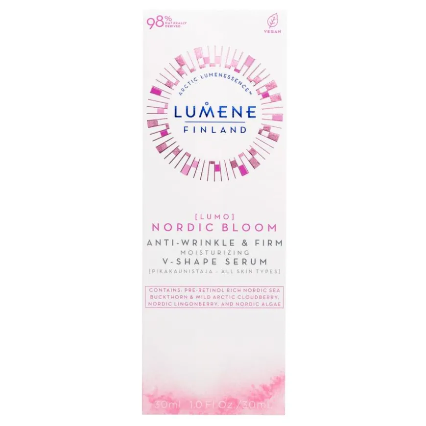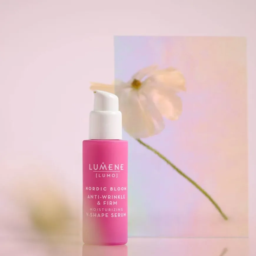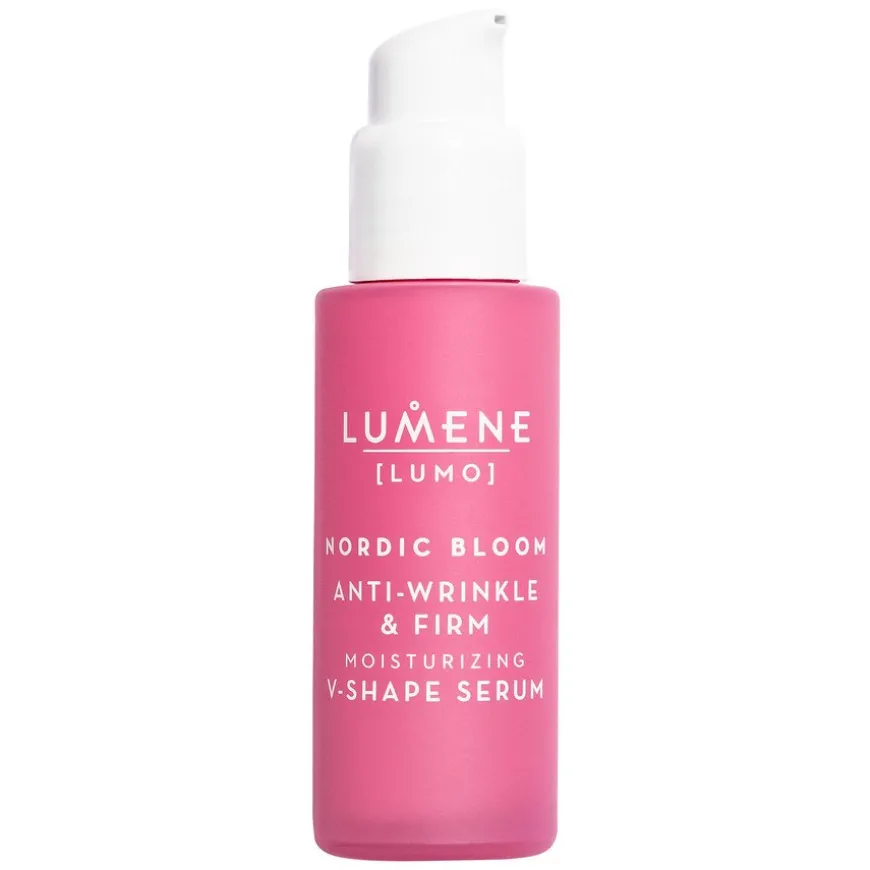 Lumo Nordic Bloom Anti-Wrinkle & Firm Moisturizing V-Shape Serum er et fuktighetsgivende mirakelserum som øyeblikkelig hjelper til å forskjønne utseendet på ansiktets konturer og gir huden et fastere, jevnere og mer strålende utseende fra første gangs bruk. Produktet bidrar til å minimere utseendet på linjer og rynker og får huden til å se fastere ut under kontinuerlig bruk. Den glansfulle og lette formelen er beriket med Lumenes innovative Nordic Berry Pre-Retinol-kompleks, det patenterte quercetinrike nordiske tyttebærekstraktet og røde alger som gjør huden fyldigere.