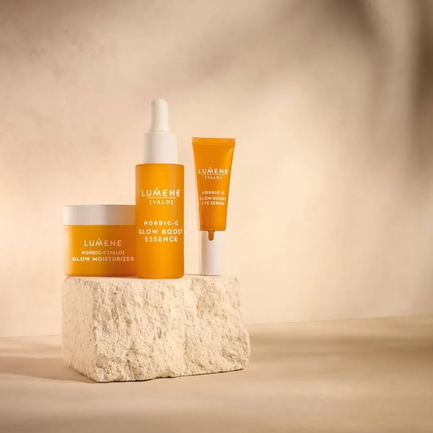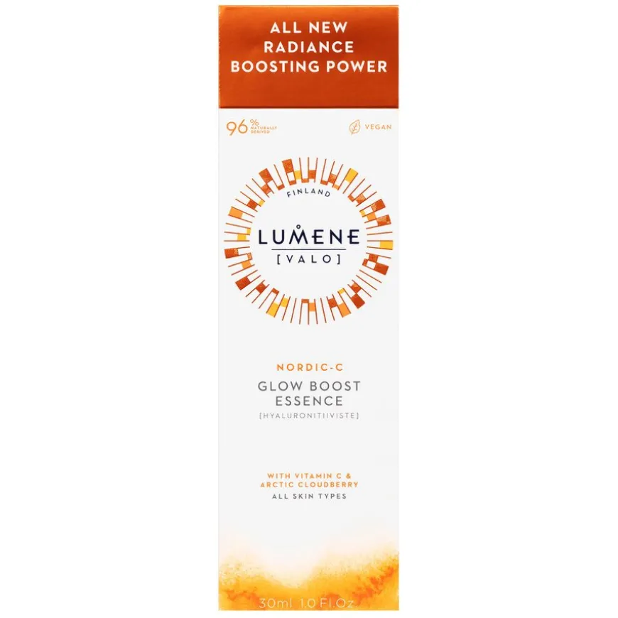 Lumene Nordic-C Glow Boost Essence er et serum utviklet for å øke gløden og intensivt fuktighet for energisk, synlig mer strålende hud. Det mirakelforsterkende serumet er superladet med en unik blanding av antioksidantrik vill arktisk multebær og vitamin C. Nå boostet med tre typer hyaluronsyre og polyglutaminsyre for ultimat glød, jobber den forbedrede formelen for å fremme utseendet til en jevnere hud som føles fyldigere, jevnere og ser mer strålende ut. Produktet er vegansk og formulert med et høyt nivå av resirkulerte og viltlagde ingredienser. Emballasjen er laget av resirkulerbare og resirkulerte materialer. Laget i Finland.