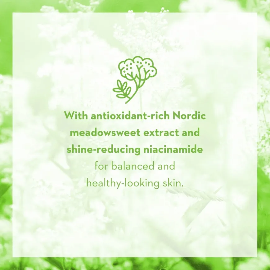 Nordic Clear Balancing Daily Serum er et balanserende serum for fet, kombinert og uren hud med en blanding av sinkglukonat og niacinamid som reduserer glans, synligheten av porer, urenheter og rødhet samtidig som det umiddelbart fukter huden. Det veganske serumet er beriket med balanserende nordisk elggress og beroligende arktisk rosenrot, føles friskt og lett på huden og absorberes raskt uten flekker. Huden får et naturlig matt, balansert og sunt utseende.