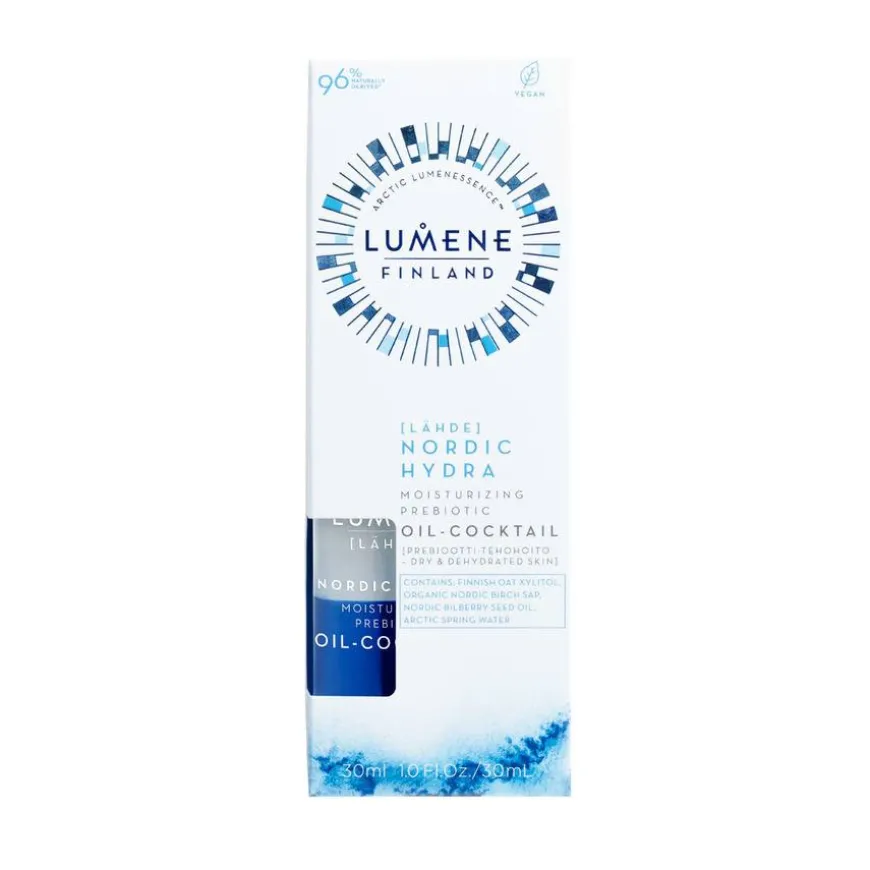 Lumene Lähde Nordic Hydra Moisturizing Prebiotic Oil-Cocktail er en intens fuktighetsgivende serum. Olje-cocktailen er tilsatt prebiotic xylitol og komplimenterer hudens fuktighetsbarriere og dens naturlige mikrobiome. Den pleiende formulaen hydrerer huden i 24 timer med den essensielle nordiske blandingen av arktisk kildevann, organisk bjørkesaft og nordisk blåbærfrø-olje. Serumet er spesielt utviklet for tørr og dehyrdrert hud.