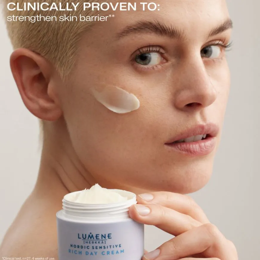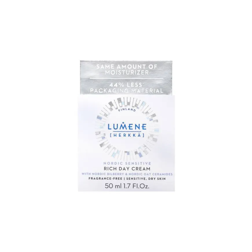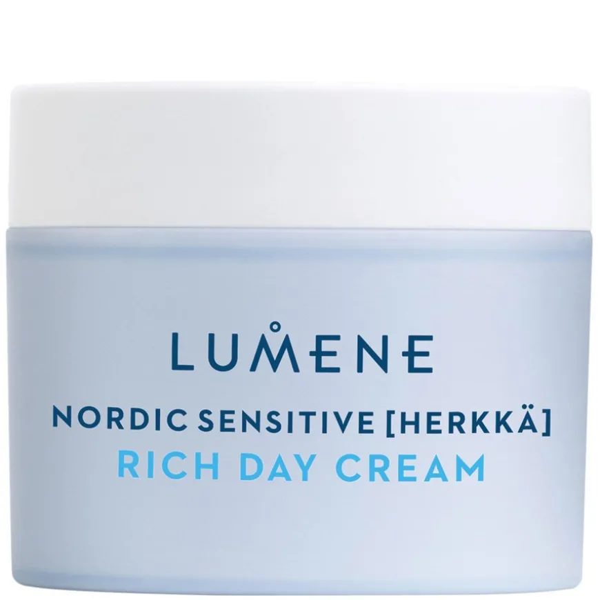 Lumene Nordic Sensitive Rich Day Cream er en rik, parfymefri dagkrem som øyeblikkelig roer ned sensitiv hud og styrker den svekkede hudbarrieren. Klinisk testet for sensitiv hud. Utviklet i samarbeid med det finske allergi-, hud- og astmaforbundet. Nordic Sensitive Rich Day Cream er en fuktighetskrem for sensitiv og tørr hud. Rik på nordisk havre ceramider og beroligende blåbærolje, lindrer og styrker denne pleide formulaen øyeblikkelig hudens barriere for en sunn og pleiet hud. Produktet er vegansk, og inneholder oppsirkulerte og viltplukkede ingredienser. Produsert i Finland.