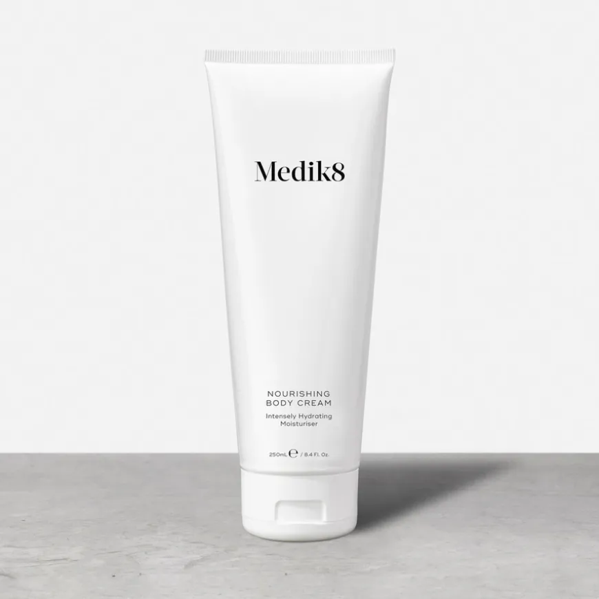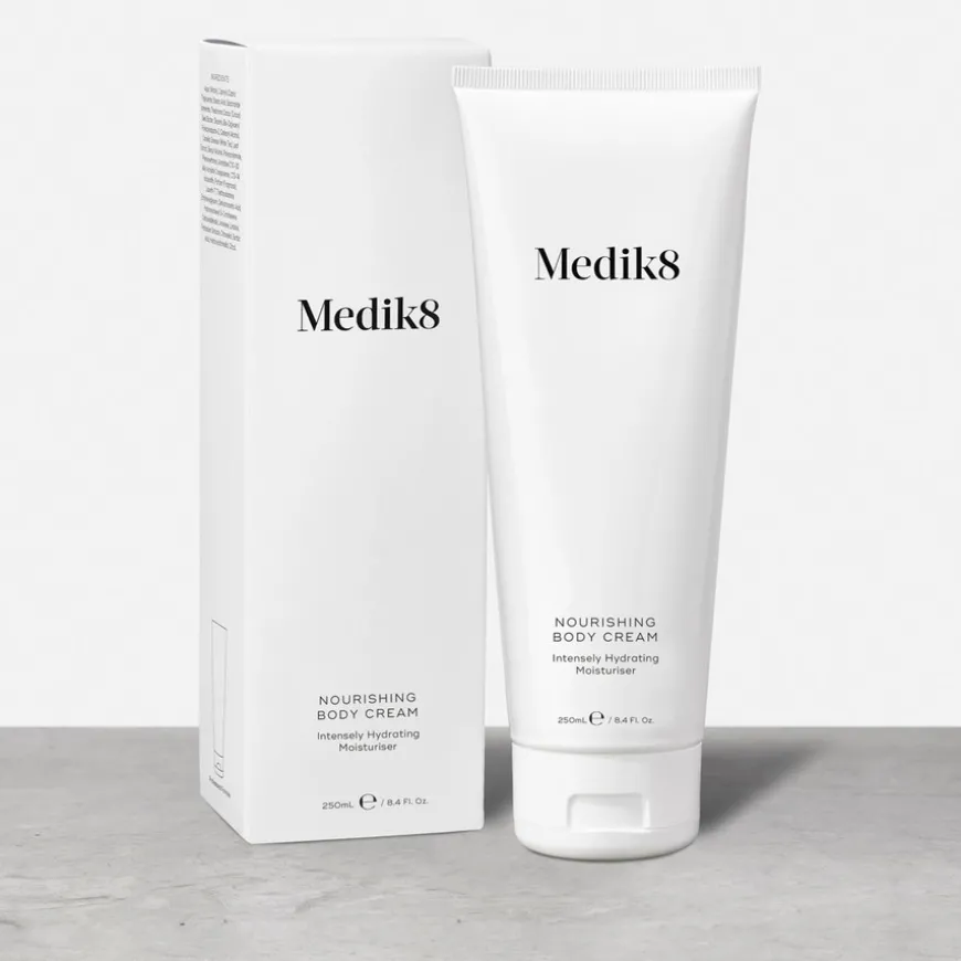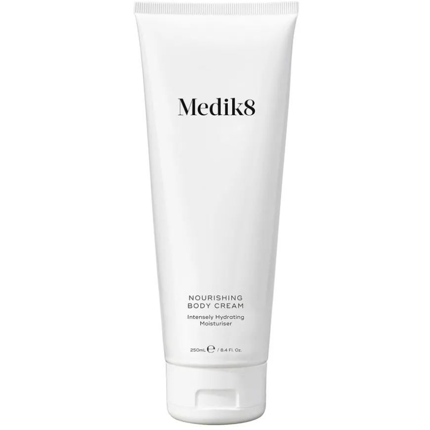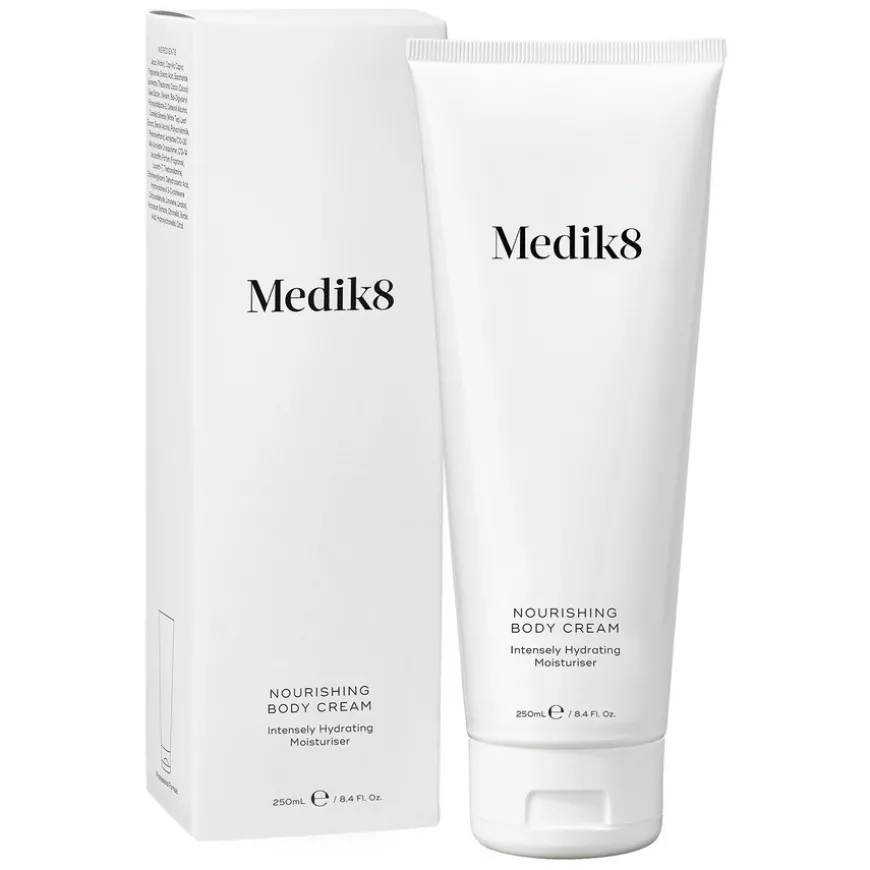 Nourishing Body Cream er en frisk, silkemyk kroppskrem som gir intensiv pleie og fuktighet til tørr og sprukken hud. Perfekt å bruke etter soling eller på hud som har blitt utsatt for tørt, luftkondisjonert kontormiljø eller kald vintervind. Holder huden behagelig fuktet året rundt og beskytter mot uttørking. Tilfører næring med en kombinasjon av shea- og kakaosmør, Medik8 Moisture Magnets™ og en høy konsentrasjon av naturlig glyserin som gir huden en silkemyk struktur.