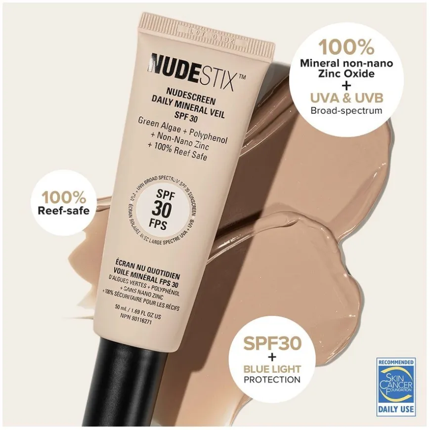 Nudescreen Daily Mineral Veil SPF30 er en 100 % mineraltonet fuktighetskrem, som er lett og fuktighetsgivende. Den oljefrie og gjennomsiktige kremen smelter inn i huden og gir en plettfri finish. Rik på veganske ekstrakter, og beskytter i tillegg mot solens UVA- og UVB-stråler og blått lys.Nudescreen Daily Mineral Veil SPF30 har flere bruksområder og kan brukes som din daglige fuktighetsgivende krem, som base eller som primer før påføring av sminke. Produktet er en 100 % reef-safe solkrem.Nudescreen Daily Mineral Veil er formulert med veganske ekstrakter av grønne alger, pasjonsblomster og lilla te som gir en fullstendig daglig beskyttelse mot UV-stråler, tidlig aldring av huden samt blålysbeskyttelse fra daglige digitale enheter. Den kommer med en lufttett pumpe som beskytter formelen.