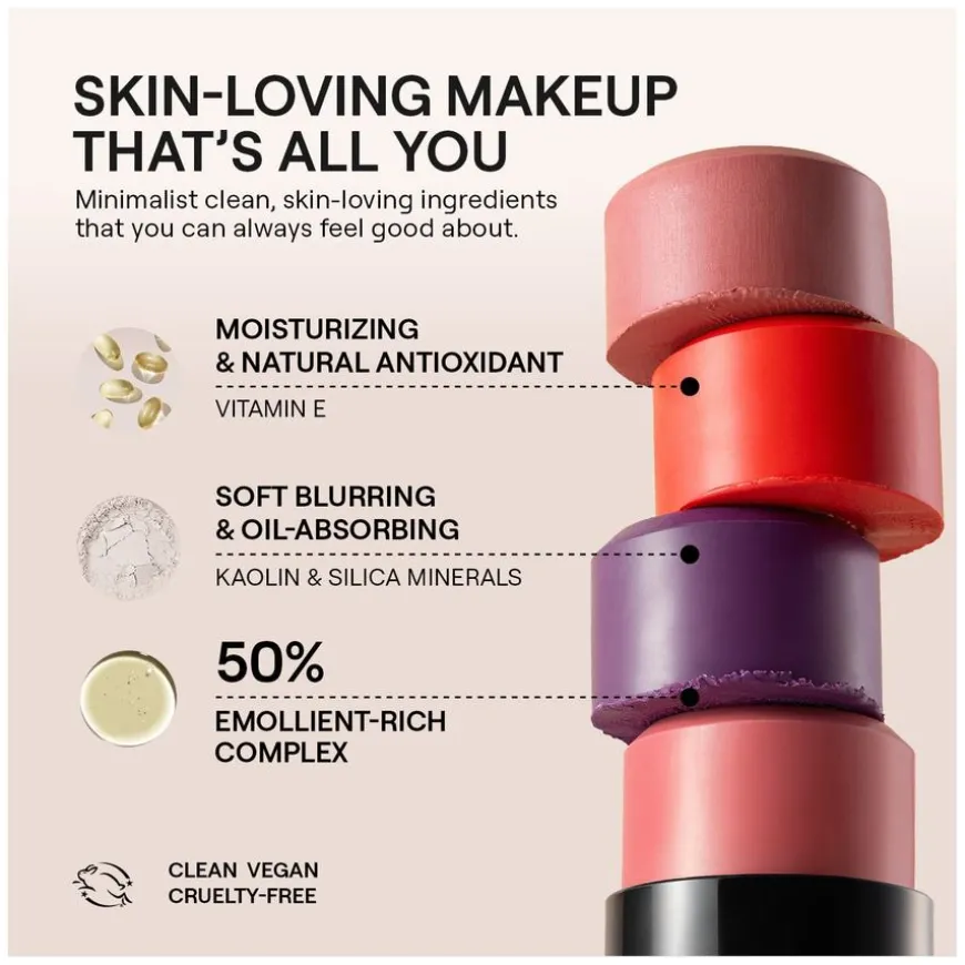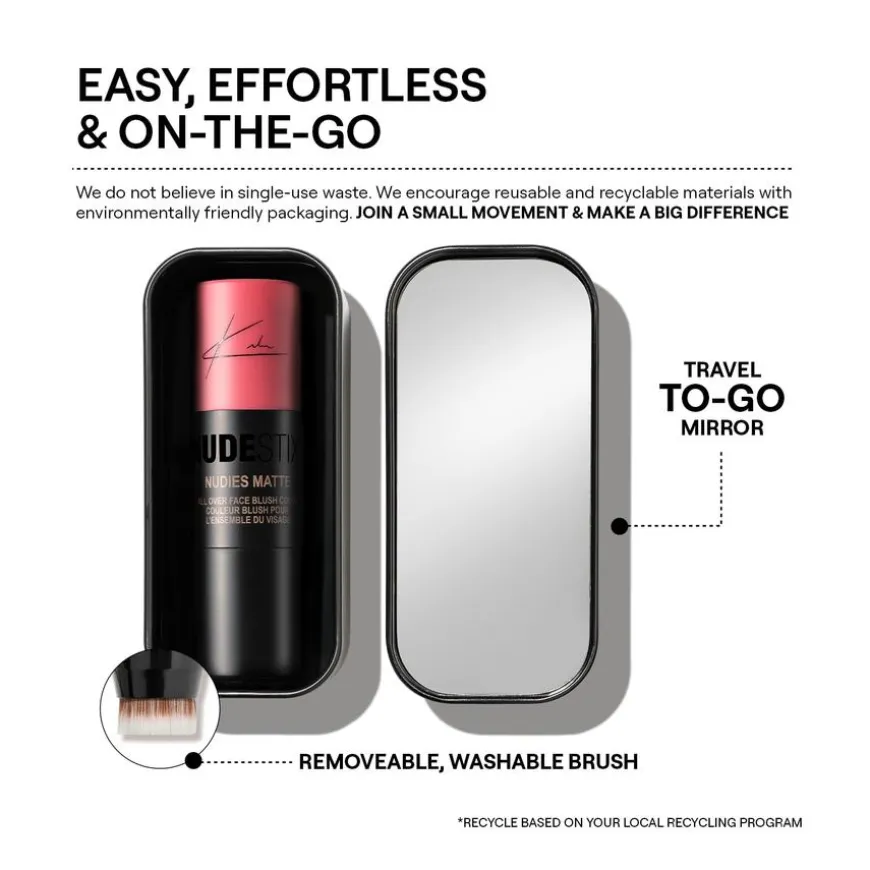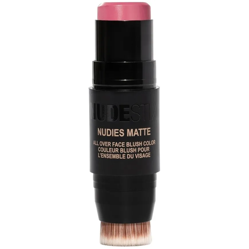 Nudies Blush Matte er en tosidig sminkebørste med myk fargebalsam i den ene enden og integrert blandingsbørste i den andre. Sminkebørstsen med den matte fargen kan brukes på øynene, kinnene og leppene. Kremen smelter på huden for å se naturlig ut. Fargene kommer i en rekke nøytrale toner, slik at du kan finne den nyansen du liker best.