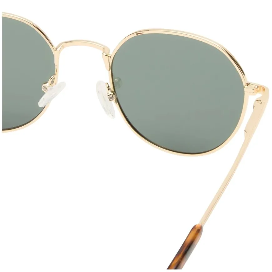 Brillen har en gullfarget metallramme kombinert med polariserte khaki mono-linser, som effektivt reduserer gjenskinn og gir forbedret visuell klarhet. Den robuste metallkonstruksjonen er utstyrt med allergivennlige, polstrede PVC-nesepads, som sikrer en komfortabel passform. De knuse- og ripebestandige polykarbonatlinsene gir holdbarhet og skarphet.