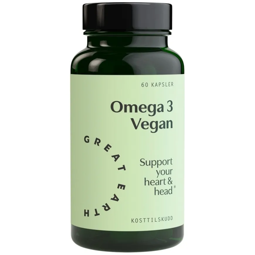 Great Eath sin vegetabilske omega 3 kommer fra mikroalger dyrket på land i et rent og kontrollert miljø, noe som gjør den helt fri for tungmetaller og andre ikke ønskede ting. Alger er rike på fettsyrene EPA og DHA, som bidrar til normal funksjon av hjerte, hjerne og syn. Å tilsette ekstra omega 3 er spesielt viktig for gravide og ammende kvinner, da DHA bidrar til normal utvikling av hjernen og øynene til fostre og spedbarn. Gjelder et inntak på 200mg DHA i tillegg til 250mg DHA og EPA som er anbefalt for voksne.