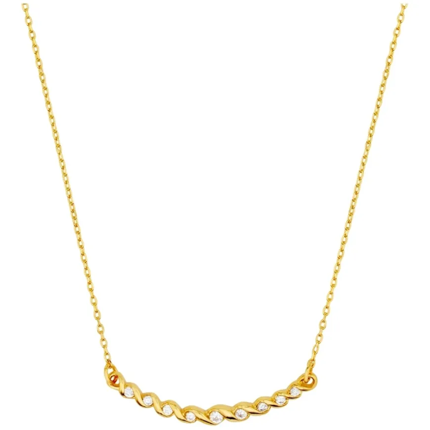 Crystal Wave Curved Bar Necklace er et stilrent halskjede med et bølget stanganheng dekorert med glitrende cubic zirconia. Halskjedet kombinerer moderne enkelhet med et hint av luksus, og passer perfekt til både jobbantrekk og festgarderobe.