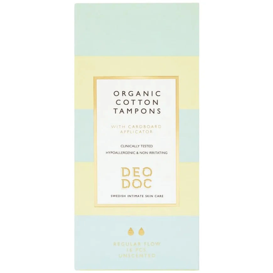 Organic Cotton Tampons with Applicator Regular fra DeoDoc er skånsomme tamponger laget av 100 % økologisk bomull, uten syntetiske materialer eller plast. Utviklet med patentert teknologi for å forhindre fiberrester, gir disse tampongene en tryggere og bedre skjedehelse. Tampongen kommer med en biologisk nedbrytbar pappapplikator som gjør innsettingen enkel og hygienisk. Passer for moderat blødning. En miljøvennlig og trygg løsning for intimhelse.