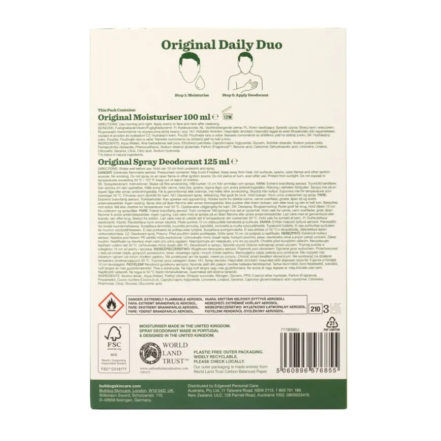 La Bulldog ta vare på din daglige rutine med Original Daily Duo, gaveeske som inneholder to favoritter: Original Moisturiser og Original Spray Deodorant.