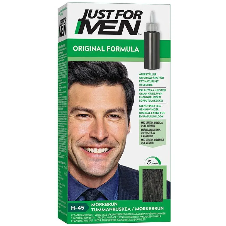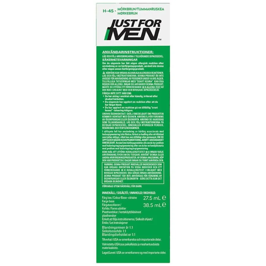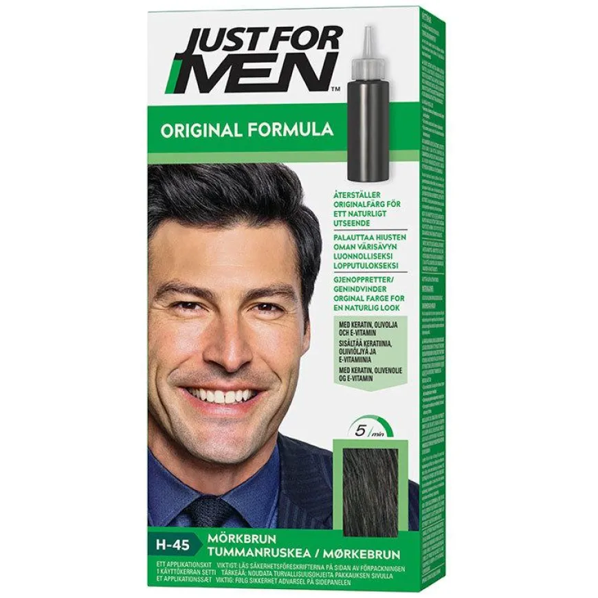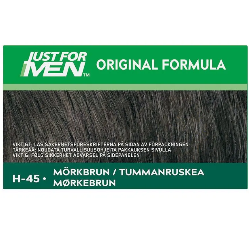 Original Formula Dark Brownfra Just For Men er en hårfarge somfjerner det grå håret på bare fem minutter. Fargen dekker dine grå hår helt og effektivt.Fargen fokuserer bare på det grå håret og bevarer subtile variasjoner av din naturlige hårfarge. Den erenkel å påføre, og det tar bare fem minutter å farge grått hår som også varer til det grå vokser tilbake.Den inneholder protein, vitamin E, aloe og kamille som gir næring til håret ditt når du farger det. Hårfartgen får håret til å se sunnere og tykkere ut etter hver faring. Den ammoniakfrie formelen forårsaker ingen skade på håret. Håret blir mykt og lettere å håndtere.