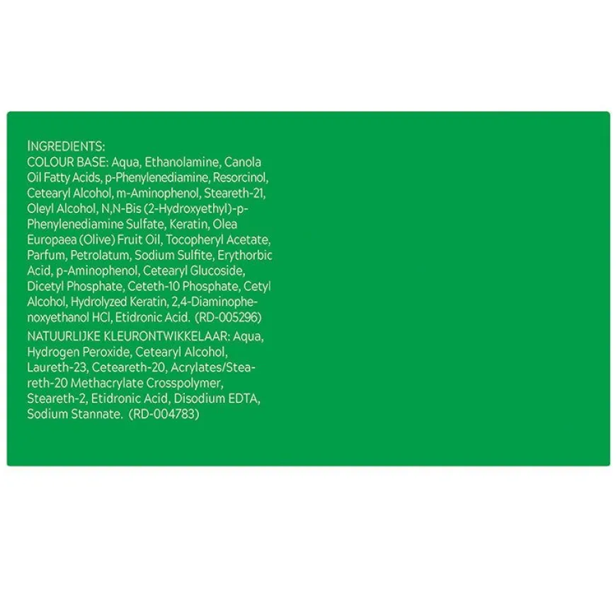 Färg: Aqua,Ethanolamine,Canola Oil Fatty Acids,p-Phenylenediamin,eResorcinol,Cetearyl Alcoholm-Aminophenol,Steareth-21,Oleyl Alcohol,N,N-Bis(2-Hydroxyethyl)-p-Phenylenediamine Sulfate,Parfum,Petrolatum,Sodium Sulfite,Erythorbic Acidp-Aminophenol,Cetearyl Glucoside,Dicetyl PhosphateTrisodium EDTA,Ceteth-10 Phosphate,Cetyl Alcohol,2,4-Diaminophenoxyethanol Sulfate FÄRGUTVECKLAREN: Aqua,Hydrogen Peroxide,Cetearyl Alcohol,Laureth-23,Ceteareth-20,Acrylates/Steareth-20 Methylacrylate Crosspolymer,Steareth-2,Etidronic Acid,Disodium EDTA,Sodium Stannate