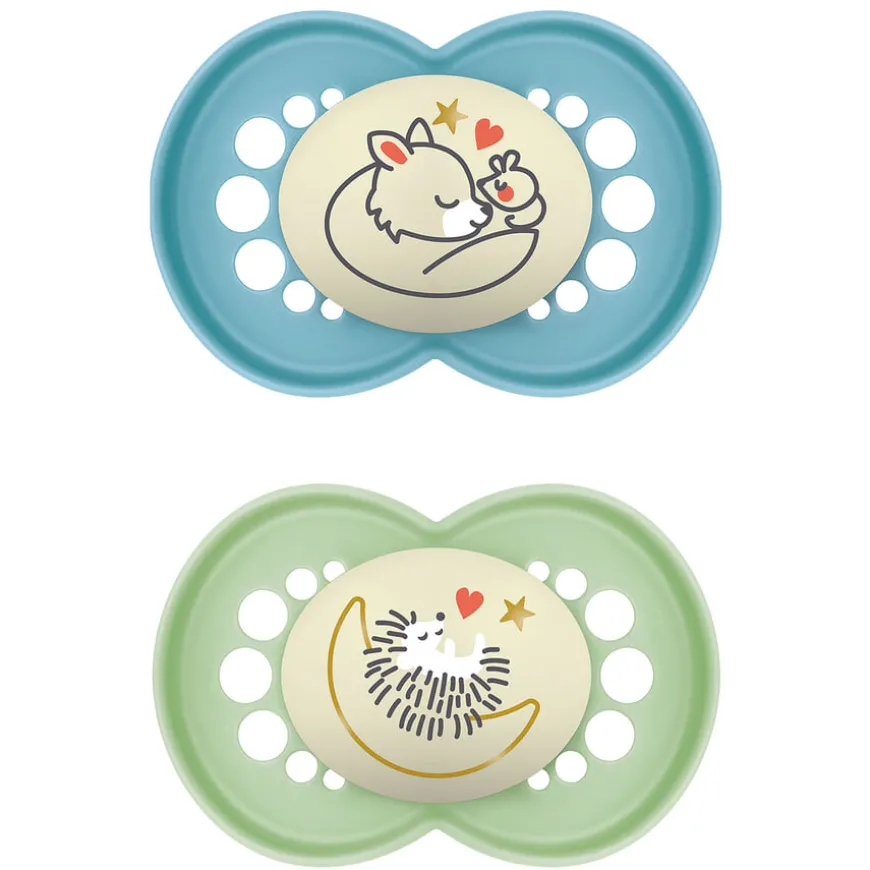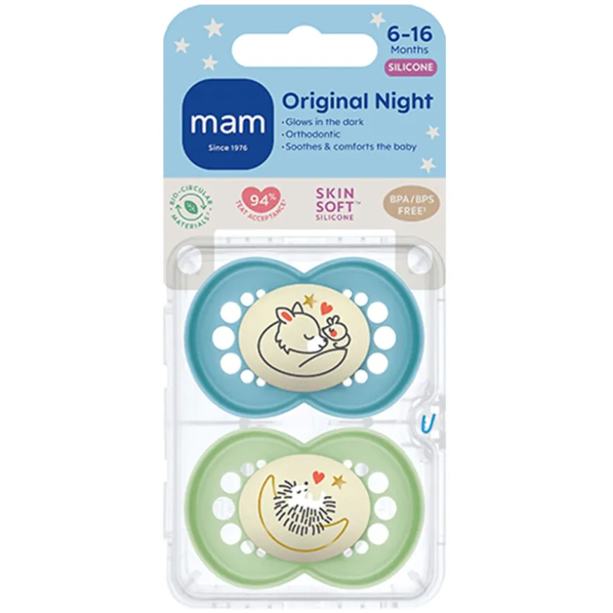 Original Night er en klassisk smokk som er skånsom mot huden takket være de store lufthullene og den knudrete innsiden. Sugedelen er laget av silkemyk silikon, MAM Skin SoftTM, som føles myk og velkjent, akkurat som mammas hud, og som aksepteres av 94 % av babyene*. MAM ønsker det beste for babyen din og planeten vår. Derfor er skjoldet, knoppen og steriliseringsboksen laget av biosirkulære materialer**.