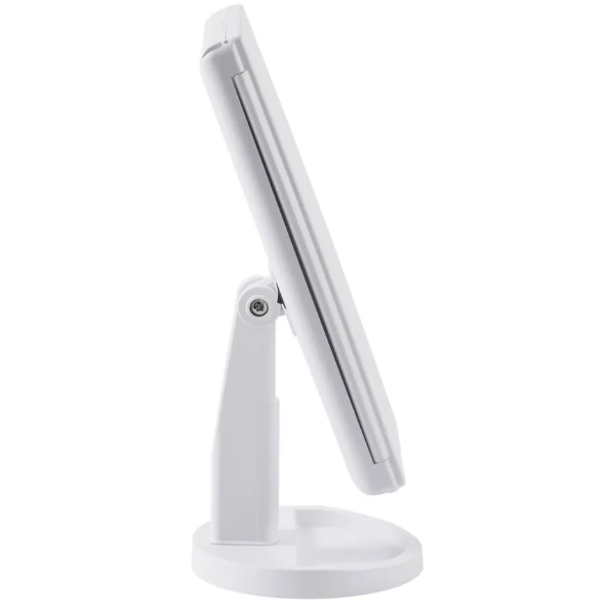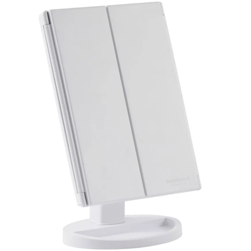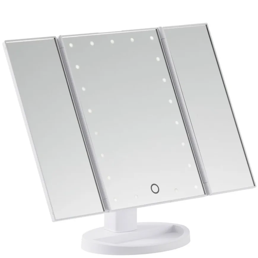 Original Tri Folded Lighted Mirror er et sammenleggbart speil som består av tre speil som gir en perfekt panoramaoversikt over ansiktet ditt.21 myke og justerbare LED-lys gir perfekt refleksjon av farger og optimalt lys for å sminke eller nappe bryn. Lysstyrken kan justeres i henhold til din egen smak basert på lyset som kreves for hver anledning – gjøres ved å trykke på en knapp på speilskjermen. Trykk på berøringsknappen for å slå av / på lyset og hold knappen inne i minst to sekunder for å justere lyset. Speilet kan enkelt justeres for å gi en oversikt fra best mulig vinkel. Dette speilet har tre brettespeil som gir deg flere forskjellige vinkler og en tredimensjonal opplevelse, mens den justerbare speilbunnen gjør det mulig å plassere speilet på flate overflater, slik at du enkelt kan jobbe med begge hender.