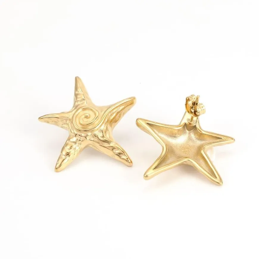 Orla Starfish Stud Earrings er et par delikate og elegante øredobber formet som sjøstjerner – perfekt for deg som ønsker en subtil kystinspirert detalj i stilen din. Øredobbene er laget av 100 % rustfritt stål og belagt med 18 karat gull for en slitesterk og glansfull finish. Med en størrelse på 25,5 mm er de lette nok til komfortabel bruk hele dagen, men store nok til å gi et tydelig uttrykk. De er 100 % vanntette og fri for nikkel, kadmium og bly – et ideelt valg for sensitiv hud. Bruk dem alene for en ren, maritim look, eller kombiner dem med andre smykker for lag-på-lag styling.