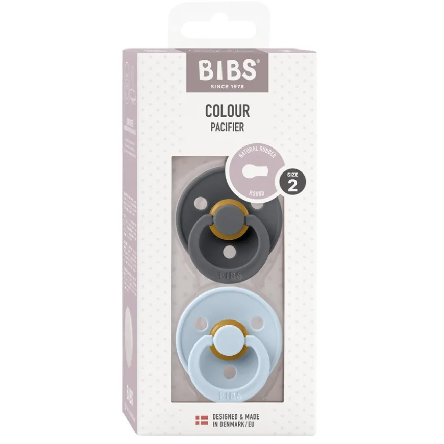 Pacifier Colour Latex er to smokker med rund sugedel i naturgummi. Den har det karakteristiske runde BIBS-skjoldet med tre ventilasjonsåpninger og en rund BIBS-gravert håndtakring.