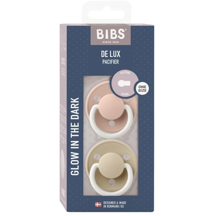 Pacifier De Lux Silicone Glow er en moderne og tidløs smokk i en vakker matt finish for et førsteklasses utseende, i tillegg lyser Glow smokkene i mørket. Smokken er lik Bibs Colour modellen, bortsett fra smokkeskjold-knotten. På denne smokken er det en bredere front-knott, perfekt for å skrive eller klistre på navnlapp på, noe som gjør den ypperlig i barnehagen. Smokken er rund og laget av silikon. Skjoldet er laget av matvaregodkjent termoplast fri for BPA og ftalater. Designet og produsert i Danmark. Ellers kommer skjoldet med håndtak, luftehull og en krom form.