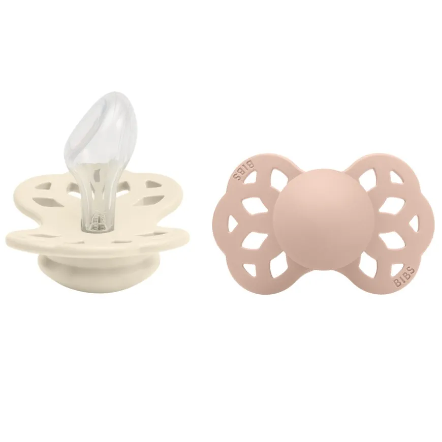 Pacifier Infinity Anatomical Silicone er smokker med en ergonomisk sugedel i naturgummi. Skapt av sammenvevde uendelige sirkler, fremstår BIBS Infinity i et moderne og innovativt design. Infinity leveres med både en ergonomisk og en symmetrisk, flat dråpeformet nipple. Skjoldet er spesielt utformet for å sikre god luftsirkulasjon rundt munnen, slik at barnets sensitive hud blir skånet så mye som mulig. Skjoldet er laget av matvaregodkjent termoplast fri for BPA og ftalater. Designet og produsert i Danmark. Smokken er tilgjengelig i silikon og i to størrelser (size 1 og 2). Smokken overholder den europeiske standarden EN 1400+A2. Her får du to smokker i en pakke.