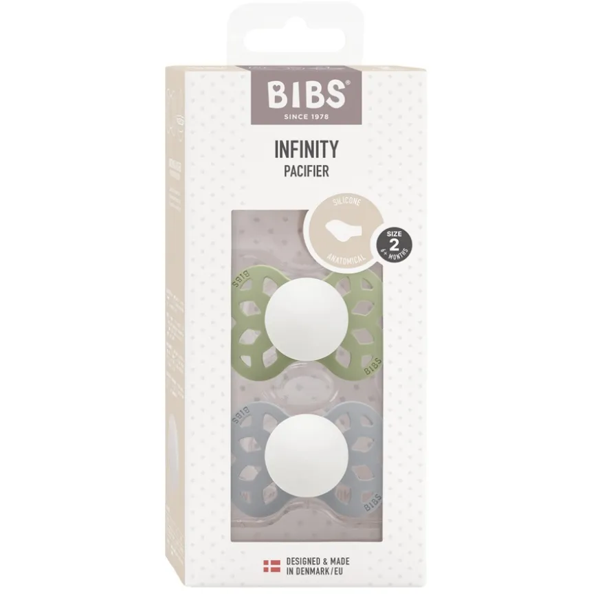 Skapt av sammenvevde uendelige sirkler, fremstår BIBS Infinity i et moderne og innovativt design. Infinity leveres med både en ergonomisk og en symmetrisk, flat dråpeformet nipple. Skjoldet er spesielt utformet for å sikre god luftsirkulasjon rundt munnen, slik at barnets sensitive hud blir skånet så mye som mulig. Skjoldet er laget av matvaregodkjent termoplast fri for BPA og ftalater. Designet og produsert i Danmark. Smokken er tilgjengelig i silikon og i to størrelser (size 1 og 2). Smokken overholder den europeiske standarden EN 1400+A2. Her får du to smokker i en pakke.