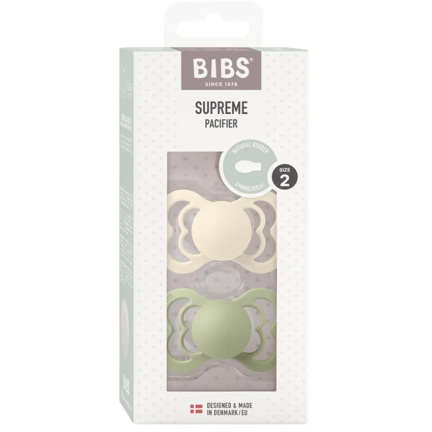 Pacifier Supreme Latex er BIBS eksklusive smokk med et bredt skjold og en symmetrisk, flat dråpeformet sugedel.Skjoldet er spesielt utformet for å sikre god luftsirkulasjon rundt munnen, slik at barnets sensitive hud blir skånet så mye som mulig. Skjoldet er laget av matvaregodkjent termoplast fri for BPA og ftalater. Designet og produsert i Danmark. Smokken er tilgjengelig i to størrelser (size 1 og 2). Smokken overholder den europeiske standarden EN 1400+A2. Her får du to smokker i en pakke.